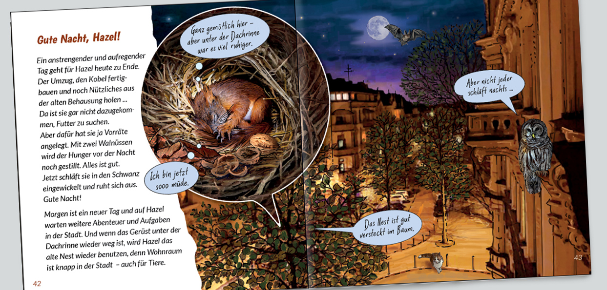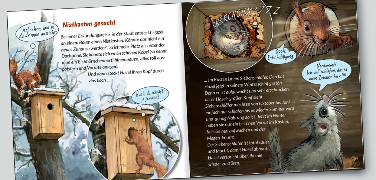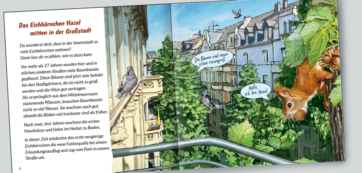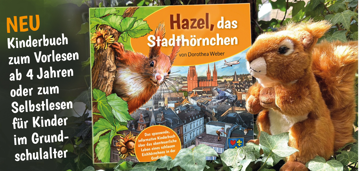 Ich habe über viele Jahre in Wiesbaden beobachtet, wie Eichhörnchen den städtischen Raum erobern und sich an Zivilisation, Lärm, Verkehr und die Klimaerwärmung gewöhnt haben. Das clevere Eichhörnchen Hazel lebt schon viele Jahre in dieser urbanen Umgebung. Darüber erzähle ich in meinem neuen Buch, das ich liebevoll illustriert habe.