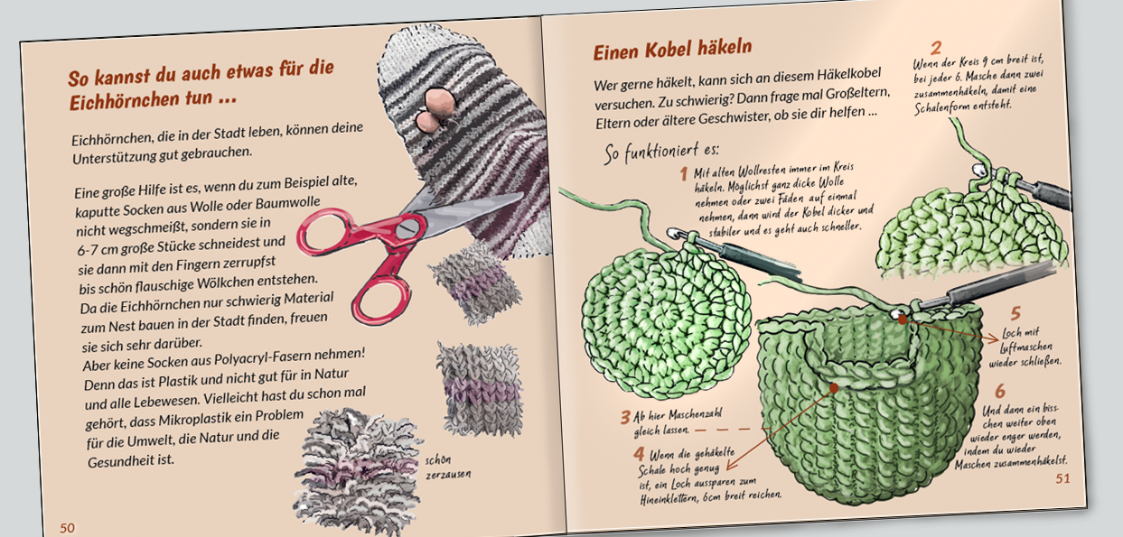 Im letzten Buchteil gibt es noch Ideen, Anleitungen und Bastelseiten wie man Eichhörnchen in der Stadt unterstützen kann.